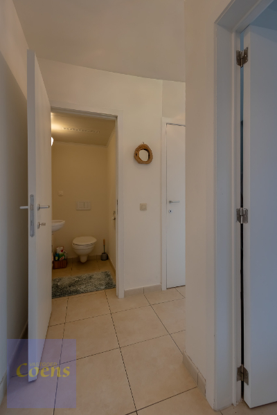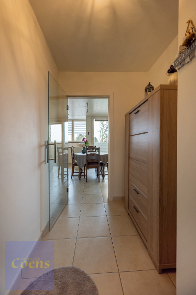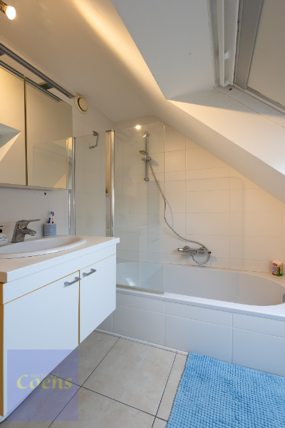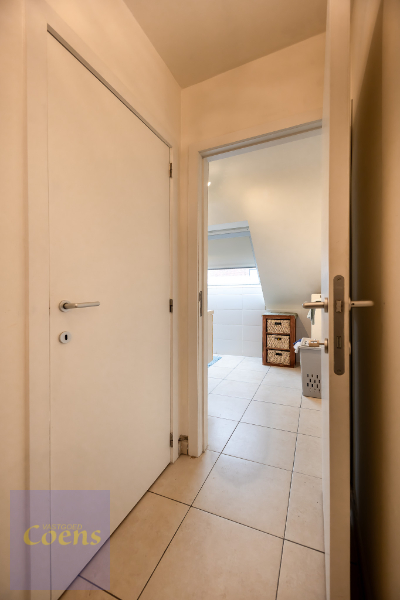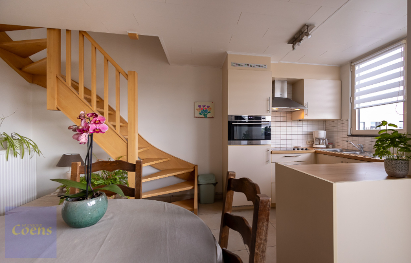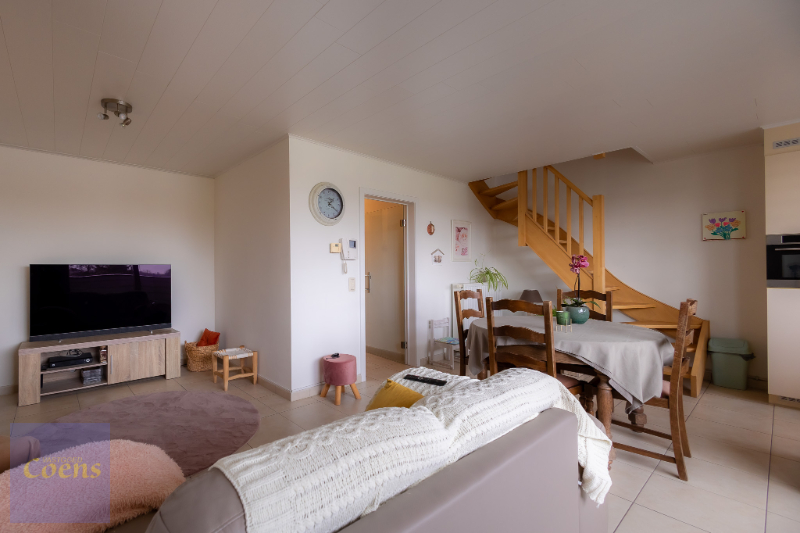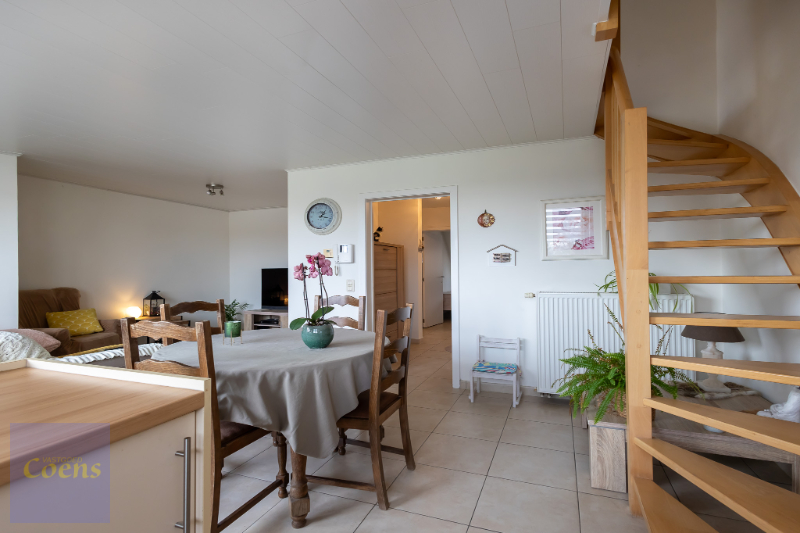 Dit duplexappartement bevindt zich op de 2e en 3e verdieping. Via de inkomhal komen we in de gezellige woonkamer met keukenhoek (uitgerust met koelkast, oven, kookplaat en dampkap). Vanuit de leefruimte geeft het terras een mooi, zongericht uitzicht op het weidse landschap. Verder vinden we op deze verdieping een slaapkamer, een badkamer met bad en wastafel, een apart toilet en een praktische berging.