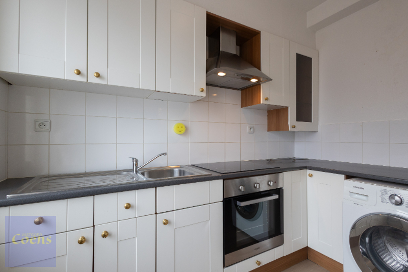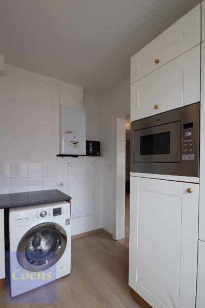 Indeling: inkom, 1 grote slaapkamer en 1 kleinere, badkamer met toilet, wastafel en douche, aangename woonkamer, aparte keuken (koelkast, kookplaat, oven, dampkap). Mogelijkheid aansluiting wasmachine in keuken.